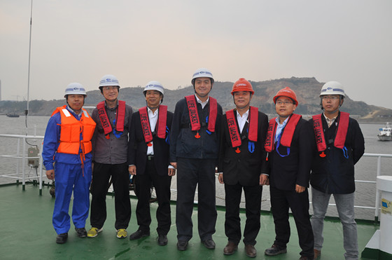 3月28日,李紅軍市長(zhǎng)一行乘海事局“海巡0952”號(hào)視察了凌晨剛剛組裝完成的口門(mén)直立段首件沉箱。