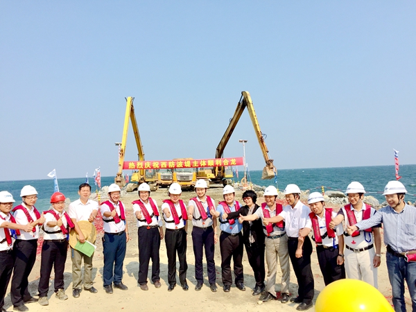 (茂名港集團(tuán)黨委書記、董事長劉乃英向市長許志暉一行匯報茂名港建設(shè)進(jìn)展) 下午3時30分,許志暉在博賀新港區(qū)西防波堤合龍施工現(xiàn)場說:“我宣布,茂名博賀新港區(qū)西防波堤陸上正式合龍!感謝奮戰(zhàn)了八百多個日夜的新區(qū)建設(shè)者們,為實(shí)現(xiàn)茂名東方大港夢打下了堅(jiān)實(shí)的基礎(chǔ)!”隨即,堤上的施工人員迅速行動起來,發(fā)動推土機(jī)、鉤機(jī)等施工作業(yè)機(jī)器,對堤身石料進(jìn)行最后推填。頓時,施工現(xiàn)場鞭炮聲、歡呼聲、掌聲雷動。橫亙在南海之濱的東西防波堤如同巨臂一般,正式擎起了茂名人民期盼已久的“百年深水大港夢”。博賀新港區(qū)防波堤工程是博賀新港區(qū)的基石,是茂名濱海新區(qū)港、業(yè)、城“三位一體”發(fā)展戰(zhàn)略的啟動工程,也是省重點(diǎn)建設(shè)項(xiàng)目。防波堤分東、西兩段,東西合璧,互為掩護(hù),不可分割,共同為博賀新港區(qū)形成一個有掩護(hù)的環(huán)抱式的風(fēng)平浪靜的現(xiàn)代化深水良港,并將為港區(qū)內(nèi)后續(xù)臨港產(chǎn)業(yè)項(xiàng)目建設(shè)、發(fā)展提供優(yōu)良條件。繼東防波堤于今年1月13日成功合龍后,隨著西防波堤的陸上合龍,正式拉開了港口建設(shè)的大帷幕,昭示著博賀新港區(qū)的建設(shè)進(jìn)入了碼頭泊位,產(chǎn)業(yè)項(xiàng)目建設(shè)新的階段。
