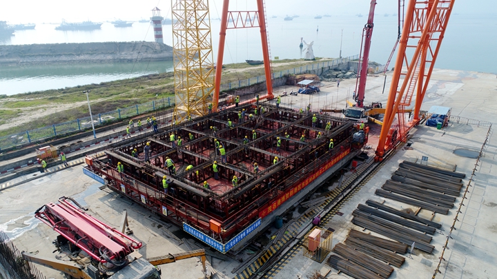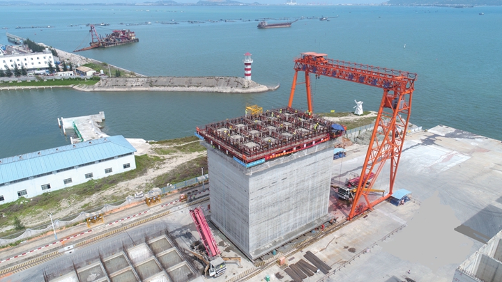 本次沉箱澆筑施工采取整體滑模工藝,澆筑過程中共采用164臺液壓千斤頂,以液壓千斤頂為提升動力部件,配合爬桿、提升架將模板整體提升,需連續(xù)滑升施工70多小時。據(jù)了解,為降低沉箱出運風險,本次采取降低沉箱上部高度工藝進行澆筑(一次澆筑高度21.5m),在沉箱安裝后以二次現(xiàn)澆接高的施工方式達到該件沉箱設計高度25.5m,沉箱總重量達4512t。