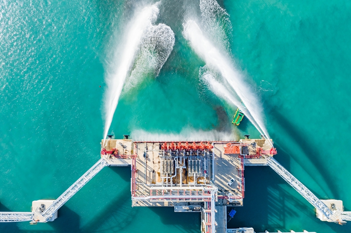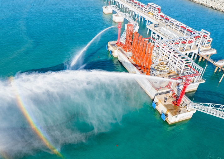 2023年12月7日下午,隨著公用工作樓首層消防泵房的紅色“巨獸”傳出一聲噪響,矗立10萬(wàn)噸級(jí)成品油泊位兩側(cè)靠船平臺(tái)上的消防炮塔噴射出兩道水柱,標(biāo)志著茂名港博賀新港區(qū)東區(qū)10萬(wàn)噸級(jí)成品油碼頭項(xiàng)目大型消防泵組和消防炮塔聯(lián)合運(yùn)行成功,為項(xiàng)目即將轉(zhuǎn)入運(yùn)營(yíng)提供消防安全保障。